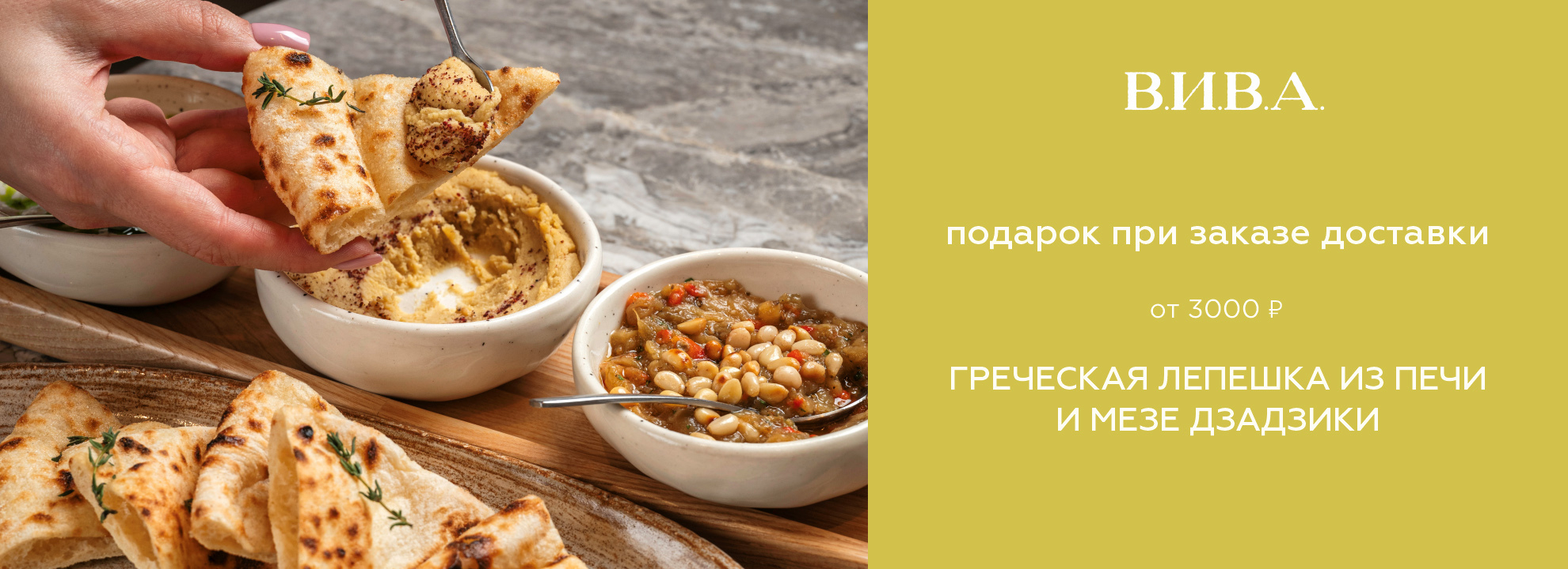 Греческая лепешка из печи и мезе дзадзики в подарок при заказе на сайте или в мобильном приложении ЛЕТИМ ДОСТАВКА от 3000 рублей.